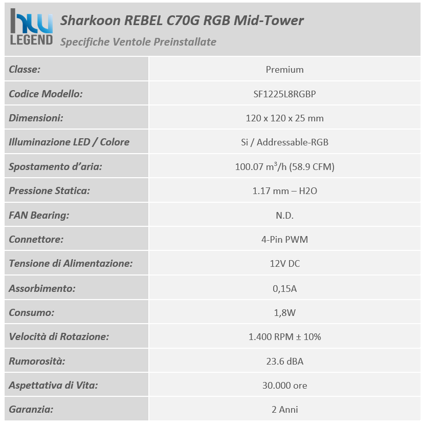 Il nuovo REBEL C70G RGB prevede una configurazione originale capace di assicurare un buon ricircolo interno dell’aria. Il produttore tedesco, infatti, ha provvisto questo particolare modello di ben quattro ventole preinstallate, ovviamente proprietarie, nello specifico delle ottime SF1225L8RGBP A-RGB PWM da 120 millimetri di diametro e 25 millimetri di spessore.