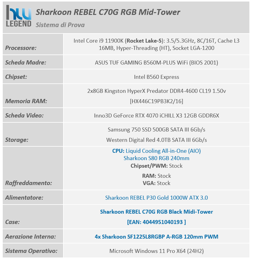 Ricordiamo che i risultati sono stati ottenuti utilizzando non soltanto le quattro ventole presenti nella configurazione “base” del cabinet, ma anche quelle previste nella dotazione nel sistema di raffreddamento a liquido All-in-One (AIO) Sharkoon S80 RGB 240mm, precisamente una coppia di ottime REBEL F50 PWM A-RGB.