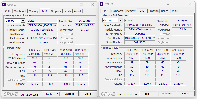 Più che buona la capacità messa a disposizione, pari a 32GB suddivisi in due moduli identici da 16.384MB ciascuno. La frequenza operativa di 3.000MHz (6.000MT/s), unita a basse latenze pari a 30-40-40-76 è in grado di garantire prestazioni più che soddisfacenti in tutti gli applicativi d’uso comune, grazie ad una larghezza di banda certamente molto elevata, ed una latenza che, seppur ancora superiore rispetto alle ultime e più spinte soluzioni di passata generazione (DDR4), appare più che dignitosa.