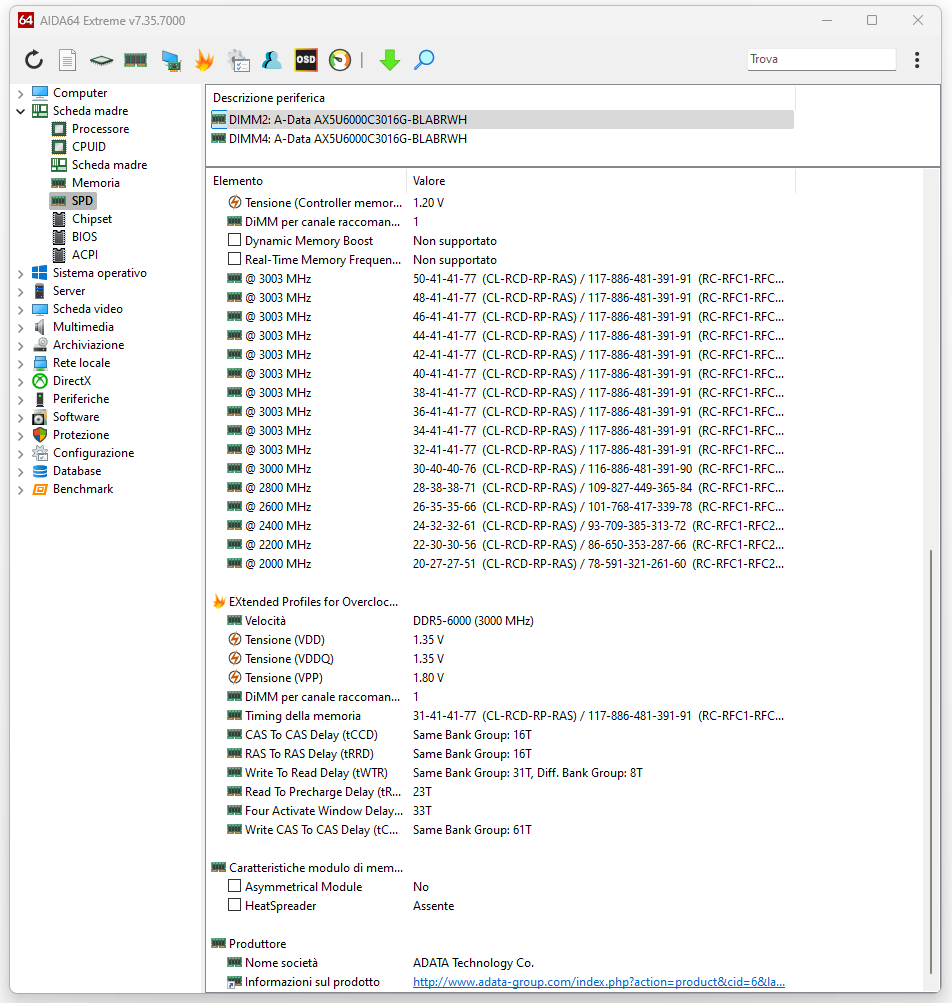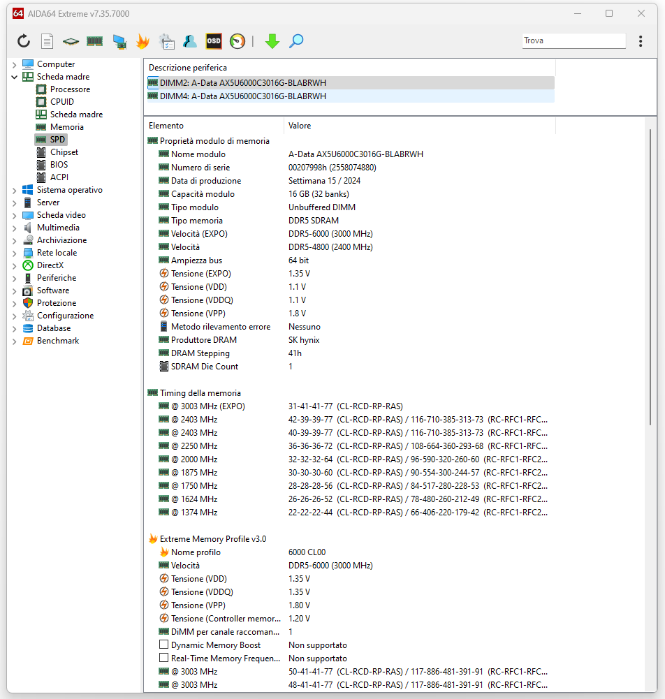 Inseriamo anche le schermate dei software CPU-Z, AIDA64 Extreme e Thaiphoon Burner, capaci di mostrare tutte le informazioni relative al contenuto dell’SPD dei moduli di memoria in esame, nonché tutta una serie di ulteriori dettagli sugli ICs scelti dal produttore.