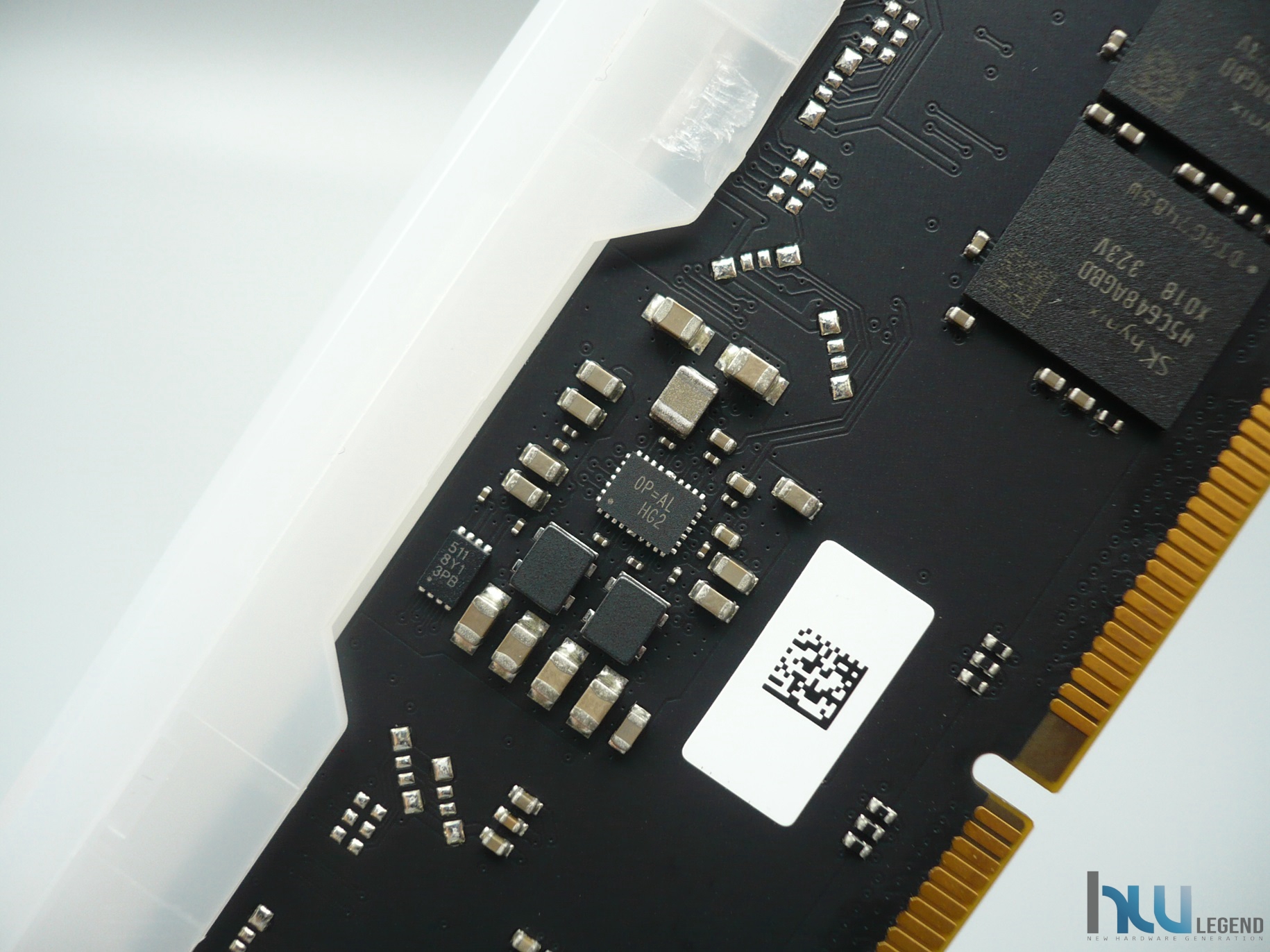In posizione centrale possiamo osservare una delle principali novità che caratterizza i nuovissimi moduli di memoria DDR5. Stiamo parlando del PMIC (Power Management Integrated Circuit) on-board, espressamente pensato per assicurare la migliore efficienza possibile nella gestione dell’alimentazione, al fine di ridurre i consumi e, di conseguenza, lo sviluppo di calore. Nello specifico, l’azienda taiwanese, ha scelto di affidarsi a Richtek Technology, impiegando il modello RTQ5132, riportante la serigrafia “0P=AL HG2” e pienamente conforme alle specifiche JEDEC.