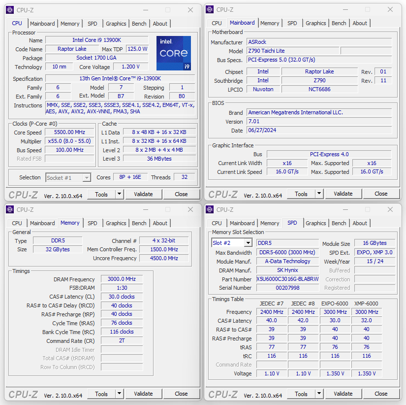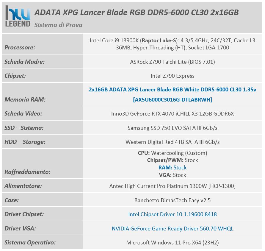 Ricordiamo che per tutti i test abbiamo mantenuto le memorie con il solo raffreddamento passivo originale, così come previsto dal produttore americano. Il sistema operativo, Microsoft Windows 11 Pro X64, è da intendersi privo di qualsiasi ottimizzazione particolare, ma comprensivo di tutti gli aggiornamenti rilasciati fino al giorno della stesura di questo articolo (Versione 23H2 – build 22631.3958).