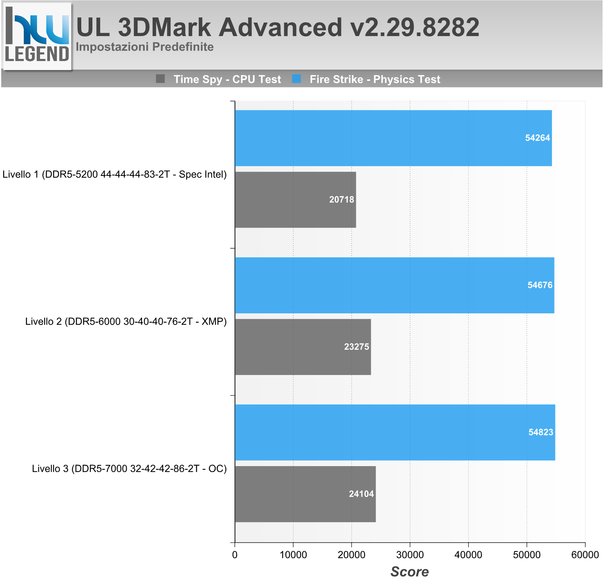 I nostri test sono stati eseguiti sfruttando i preset Fire Strike (Normal), Time Spy (Normal) con impostazioni predefinite. Nei grafici il punteggio ottenuto nei test Physics e CPU, capaci di evidenziare il vantaggio derivato da un comparto di memoria più o meno prestante.