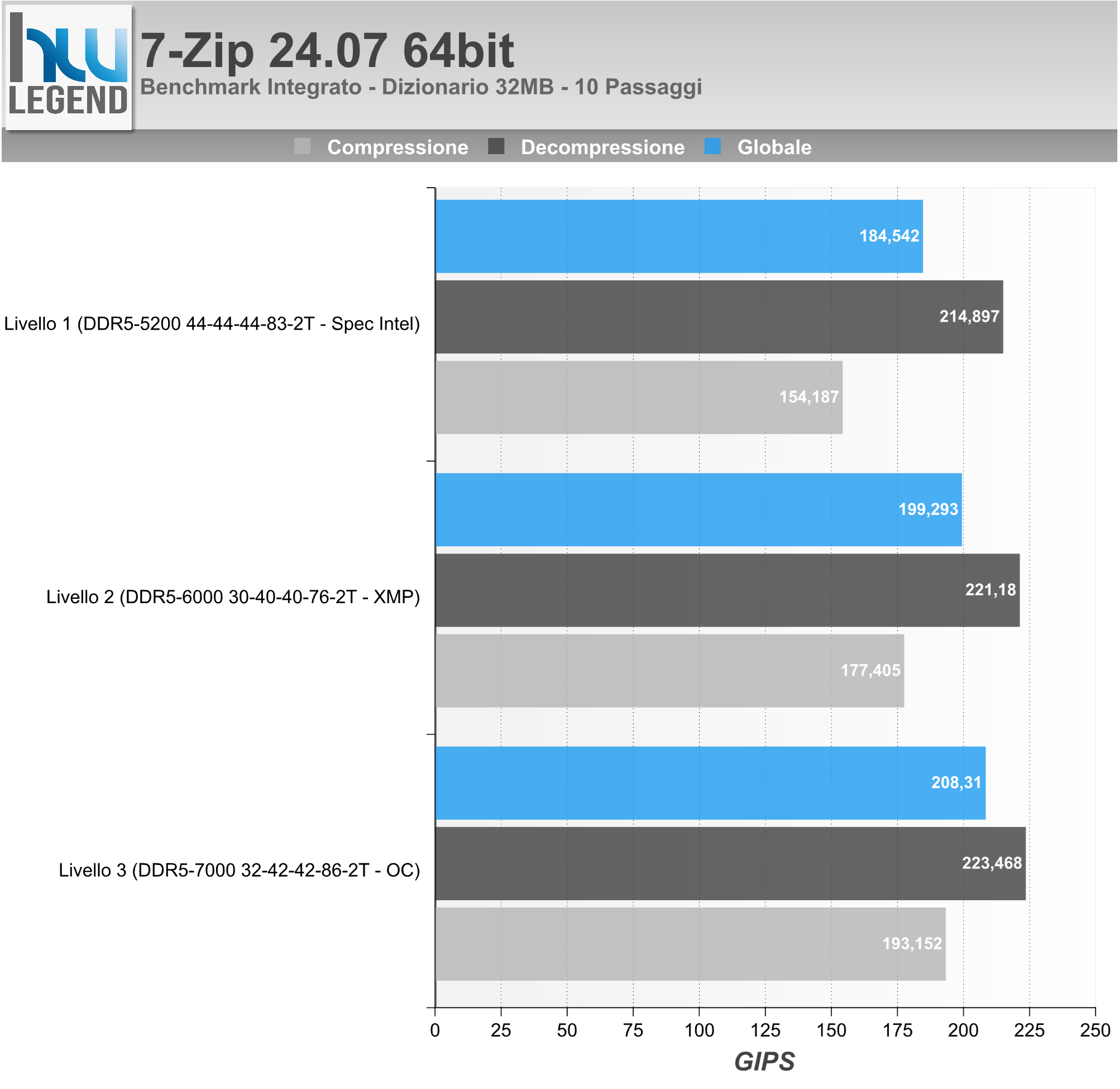 7-Zip è un noto programma di compressione che al suo interno integra un Tool per la misura delle prestazioni della macchina. Anche in questo caso saranno riportati nel grafico quanti KB/s il sistema, e in particolar modo la CPU, sia in grado di comprimere e decomprimere.