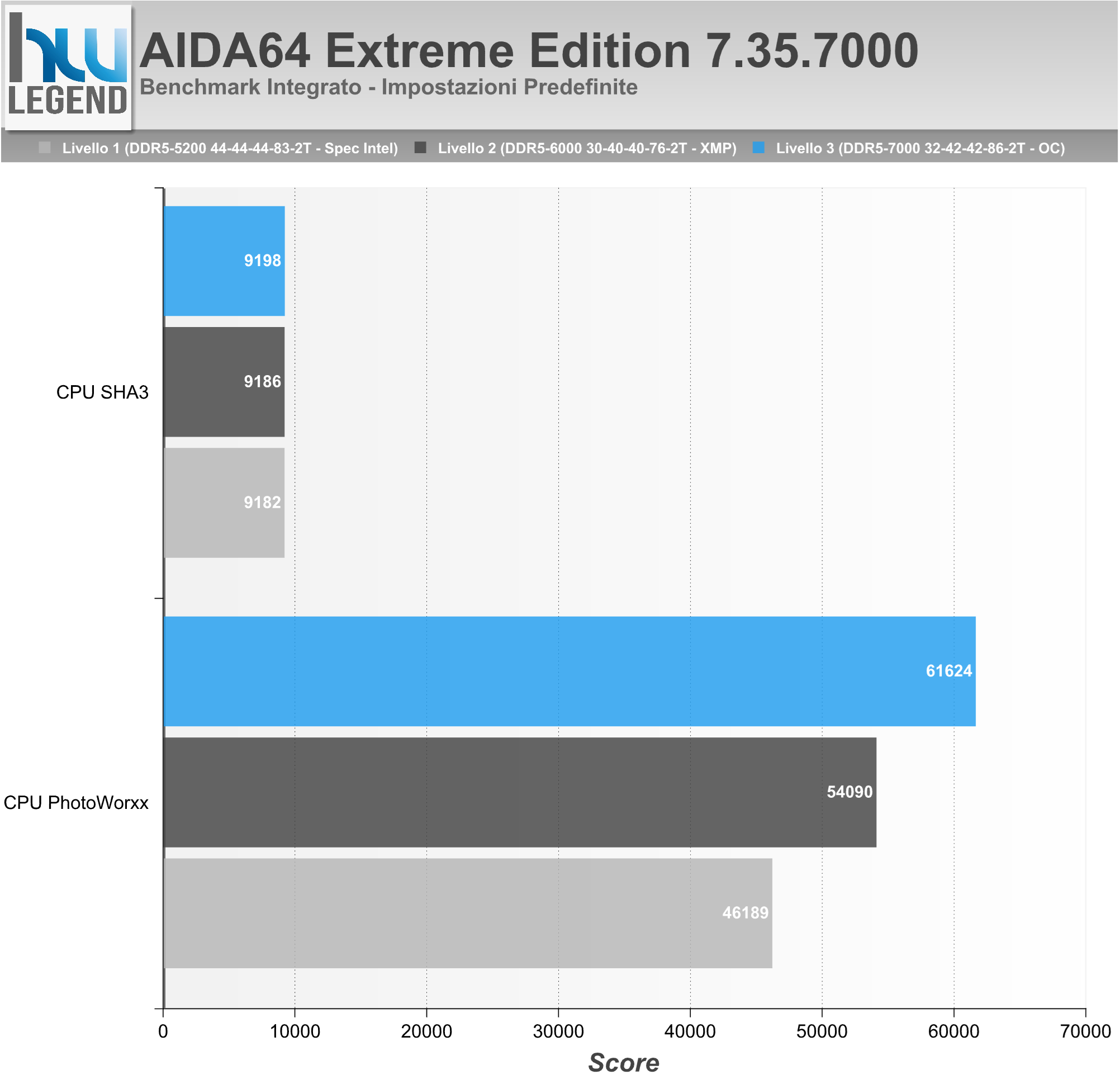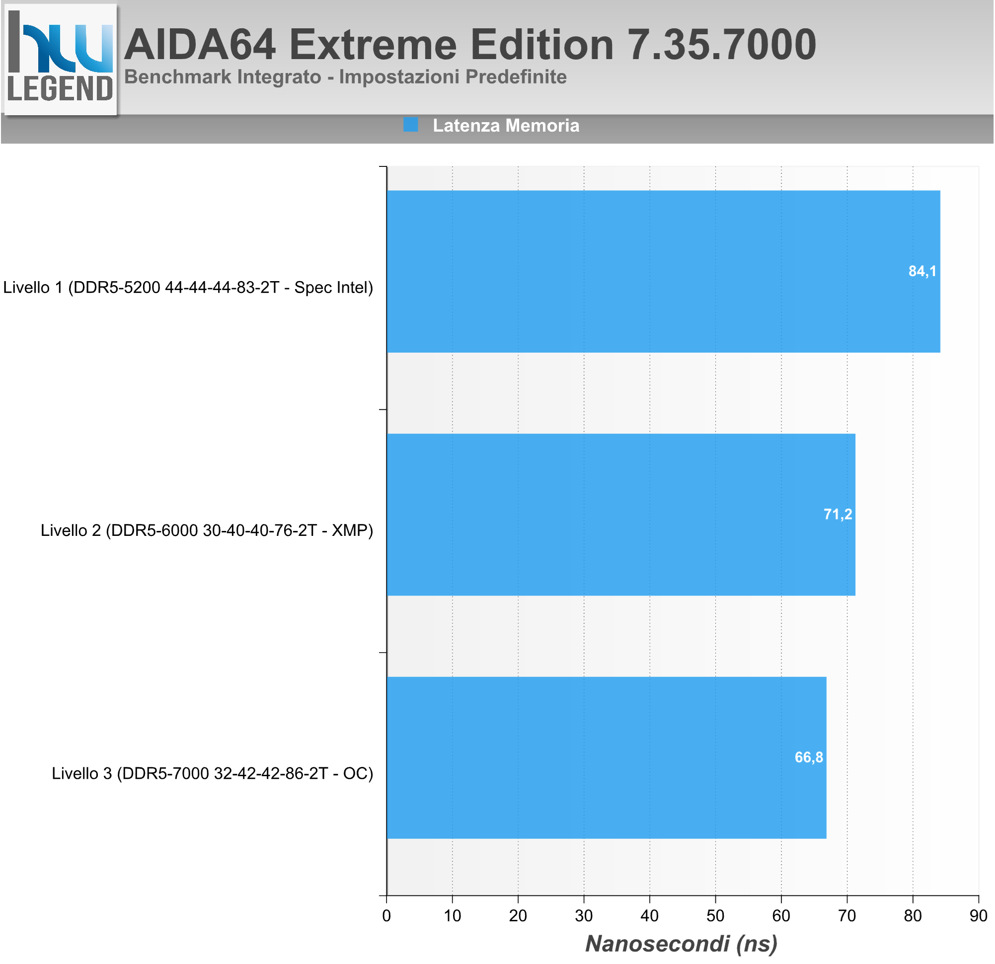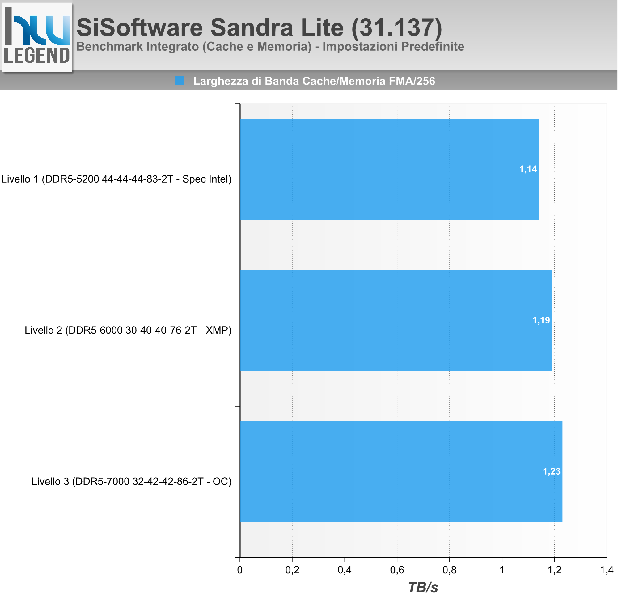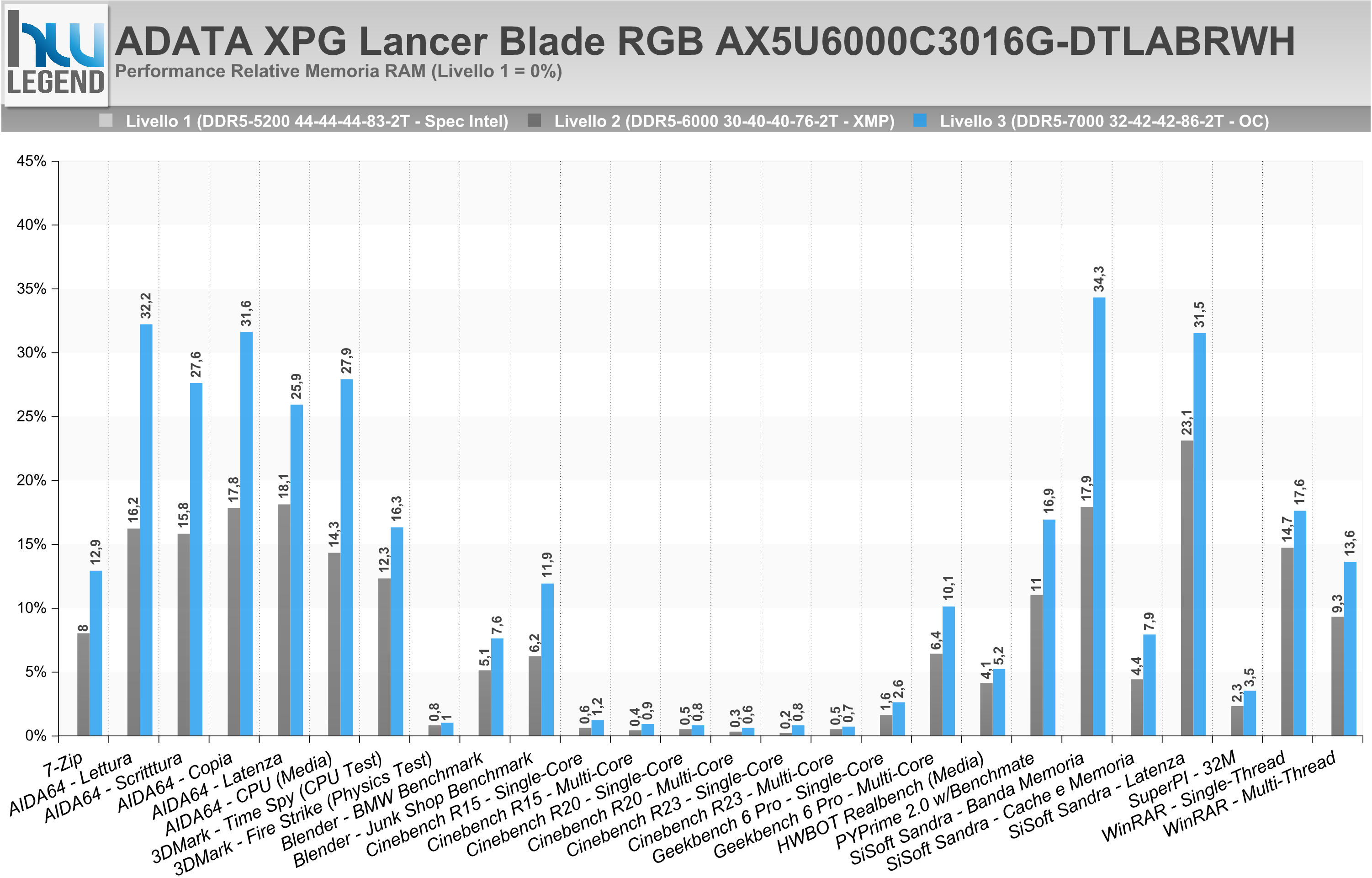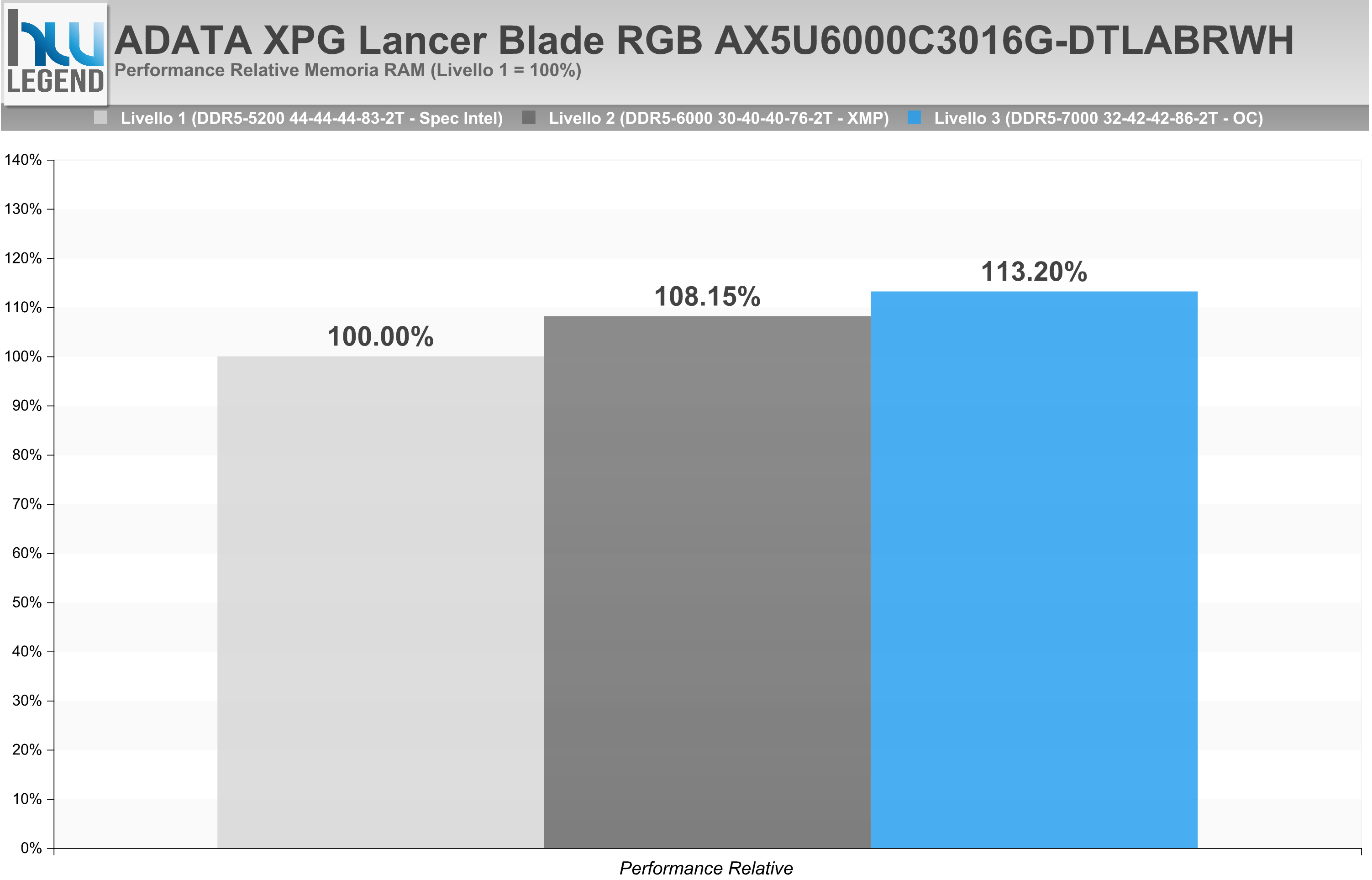 La nostra suite di prova prevede l’utilizzo dei più noti e diffusi benchmark sintetici, scelti in maniera da poter offrire un quadro complessivo preciso ed affidabile delle performance velocistiche offerte dal KIT di memoria in esame. In considerazione della notevole mole di dati rilevati durante l’esecuzione delle nostre prove abbiamo deciso di renderne più semplice l’interpretazione proponendovi un riepilogo delle performance relative registrate, ponendo come punto di riferimento i risultati ottenuti con impostazione di “Livello 1”, ossia fedele a quelle che sono le specifiche ufficiali previste dal produttore, oltre che dalla stessa Intel in abbinamento ad un microprocessore Raptor Lake-S e a moduli Single Rank in configurazione 1 DPC (singolo modulo per canale) su scheda madre 2 SPC (due slot per canale), vale a dire 2.600MHz (5.200MT/s).