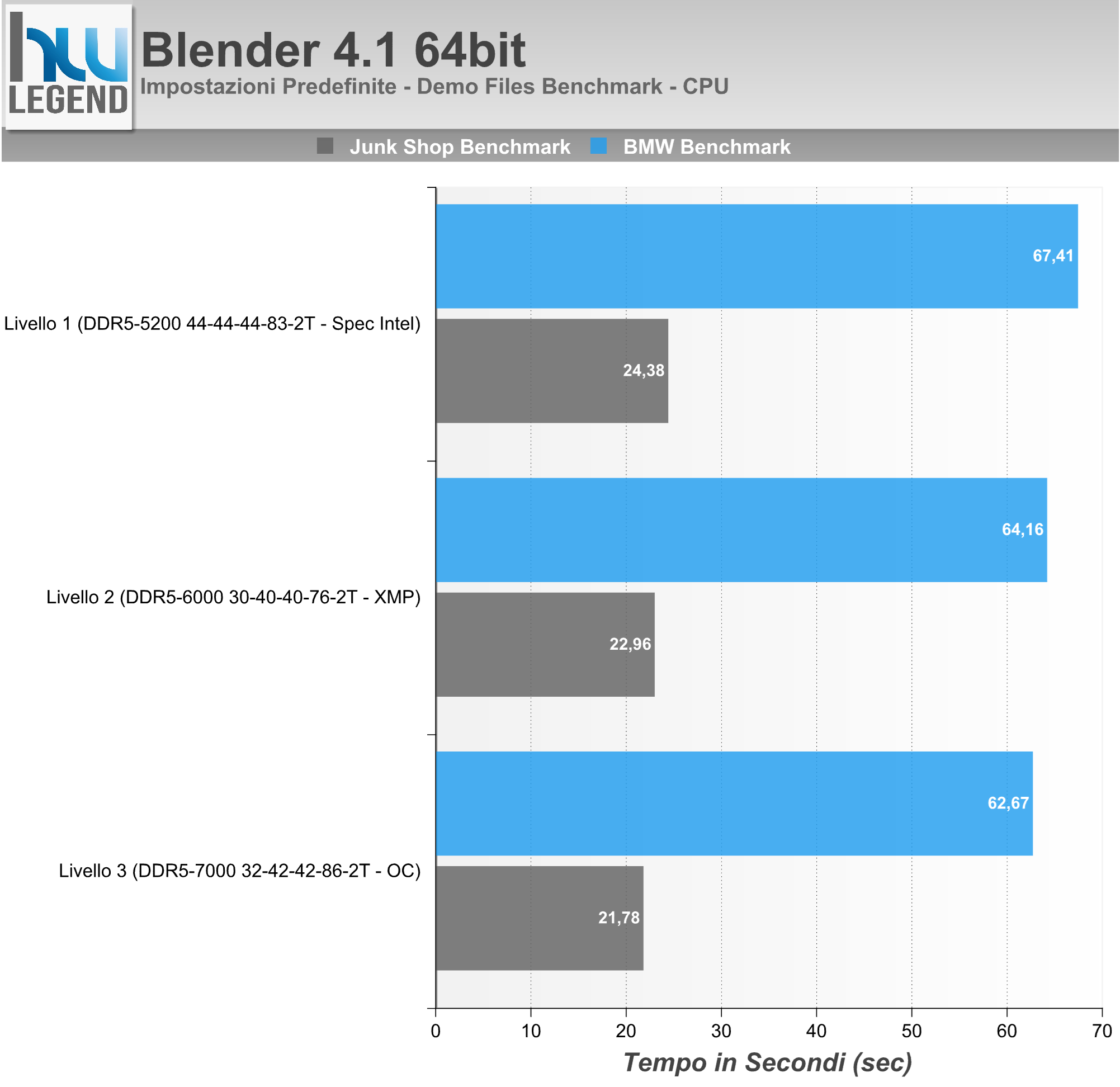 Nel grafico il tempo (in Secondi) necessario al rendering delle scene di riferimento “BMW Benchmark” e “Junk Shop”, eseguite con impostazioni predefinite.