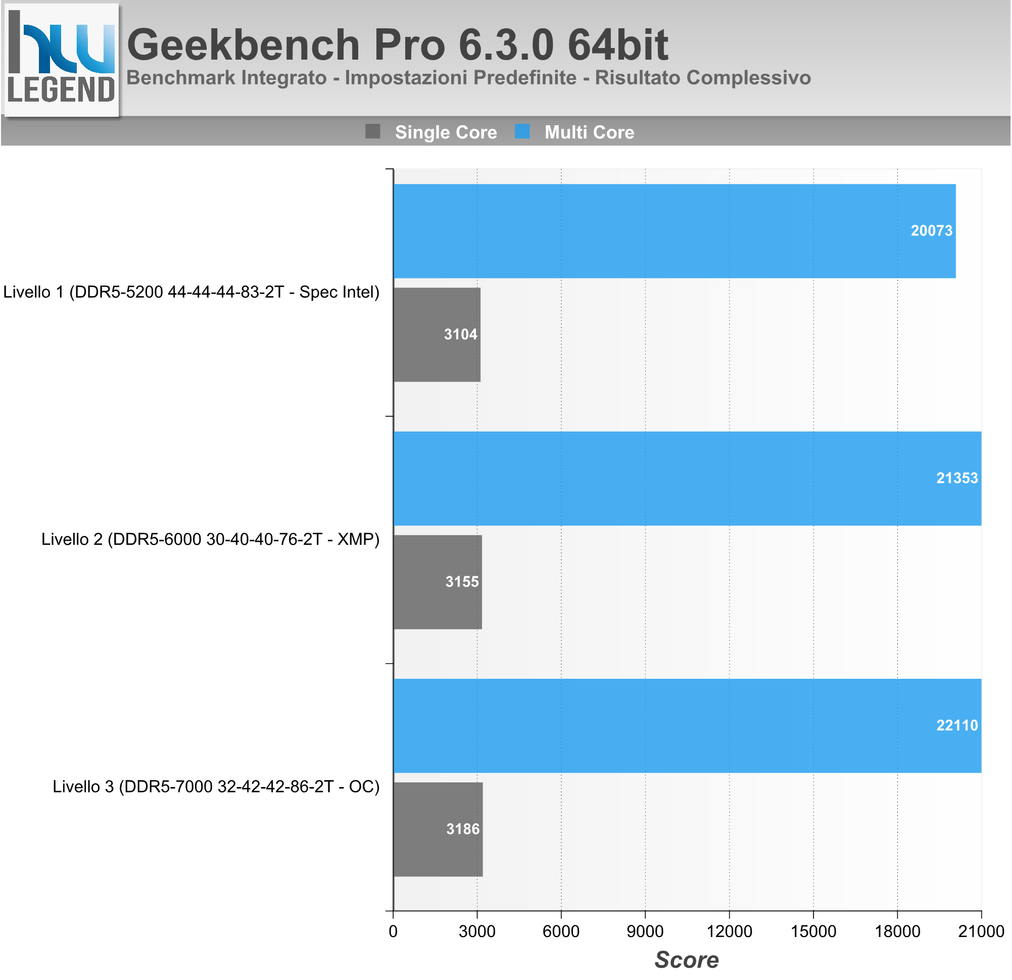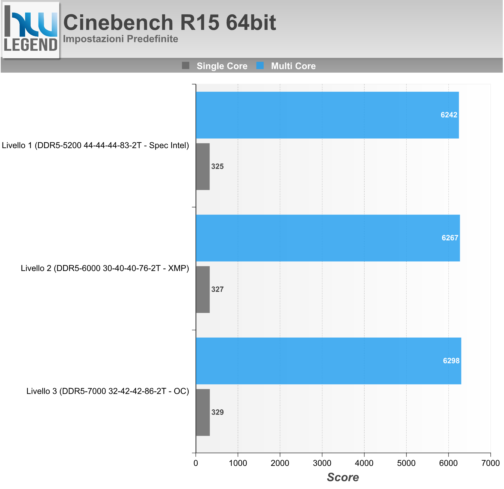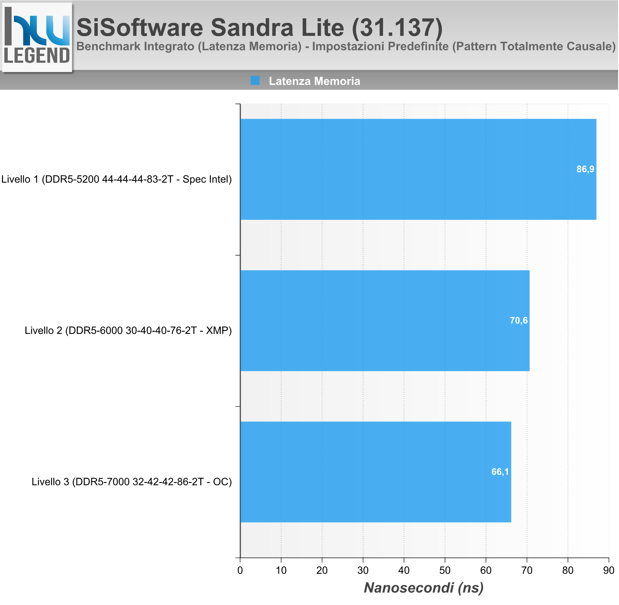 - Livello 1 (Specifiche Intel 2SPC/1DPC/SR) – Memorie a 5.200MHz – Gear2/UCLK:MCLK (1:2) 1.300MHz – Timing CL44-44-44-83-2T – 1,10V;