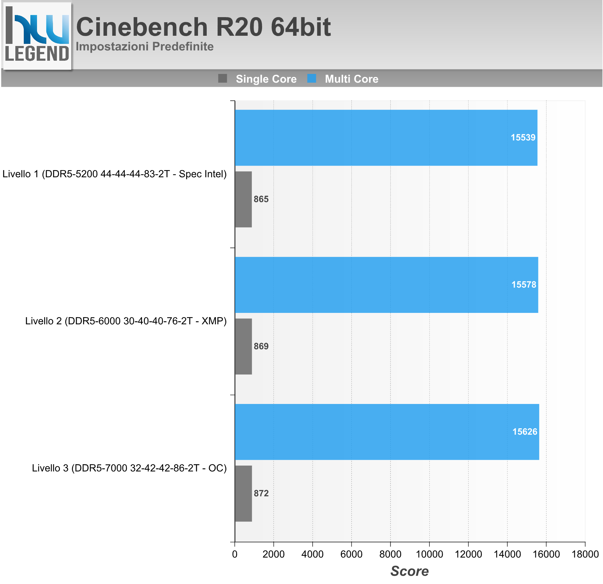 Cinebench sfrutta le potenzialità del processore centrale del sistema mediante l’utilizzo combinato di calcoli complessi finalizzati al completamento del rendering di un’immagine campione. È possibile eseguire il test in modalità “Single”, sfruttando un solo “core”, oppure “Multi”, sfruttando quindi tutti i “core” disponibili. Abbiamo eseguito i test per le RAM con le seguenti impostazioni: