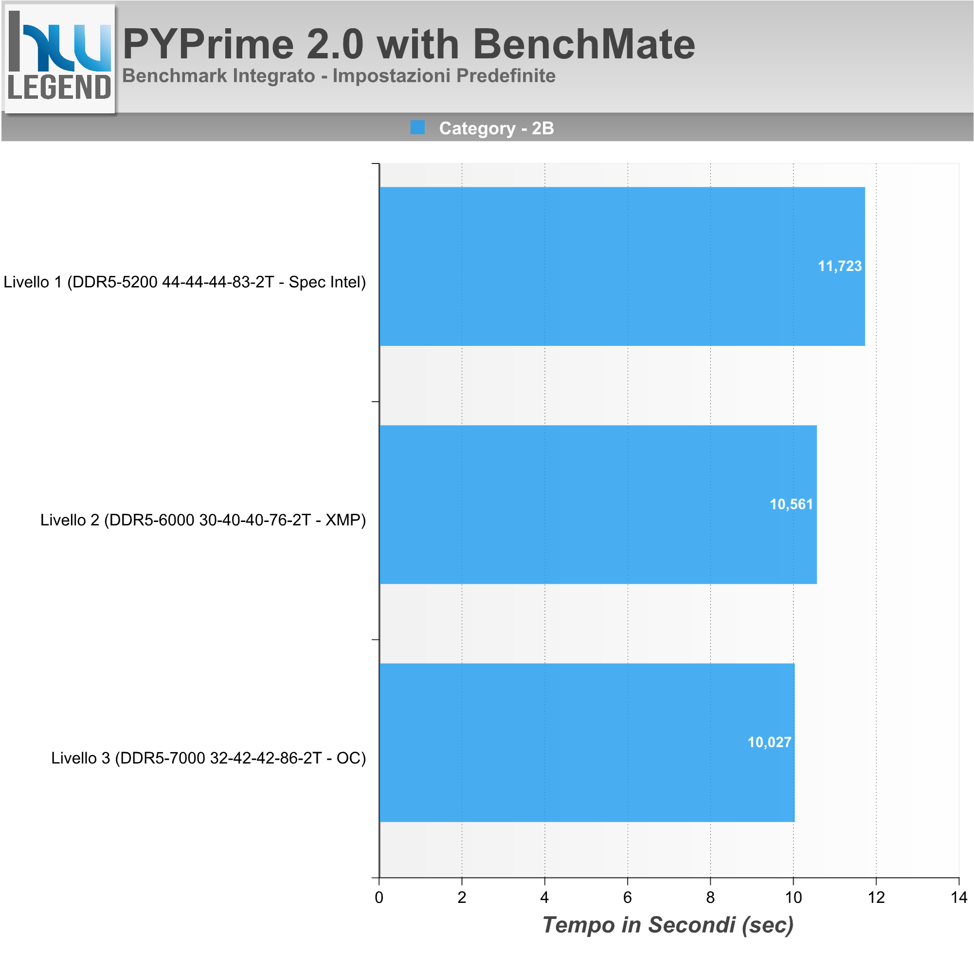 Nel grafico che segue il tempo impiegato, espresso in “secondi”, per l’esecuzione del benchmark in modalità “2B”: