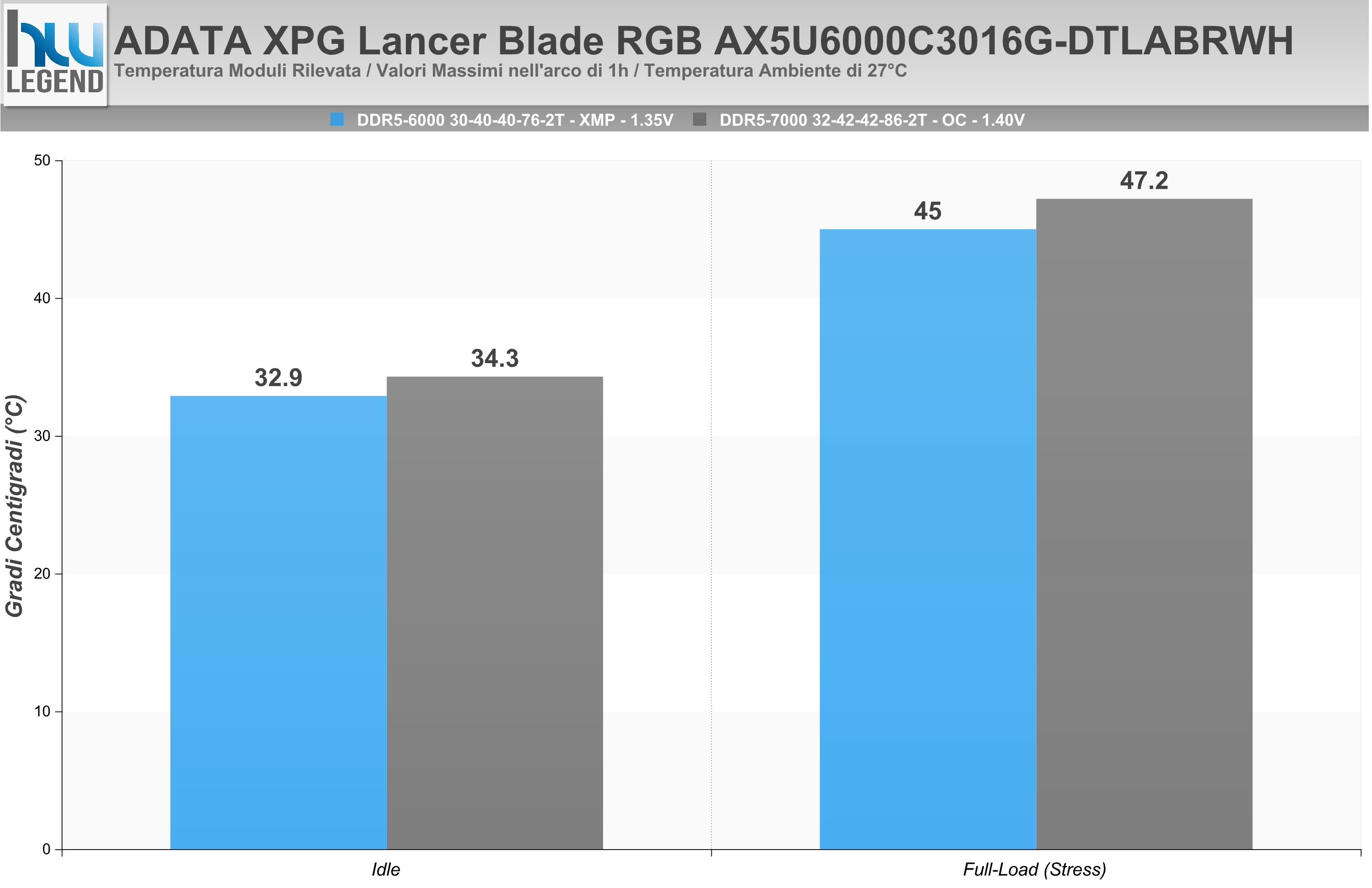 Dalle nostre prove possiamo chiaramente osservare un delta termico, tra temperatura ambientale e moduli di memoria, del tutto contenuto, a testimonianza dell’ottima qualità costruttiva e dei materiali impiegati da ADATA nella realizzazione dei suoi prodotti. Possiamo quindi tranquillamente sostenere che le memorie, anche in condizioni di lavoro fuori specifica (7.000MHz CL32 con 1.40v) non soffrono affatto di surriscaldamento anomalo.