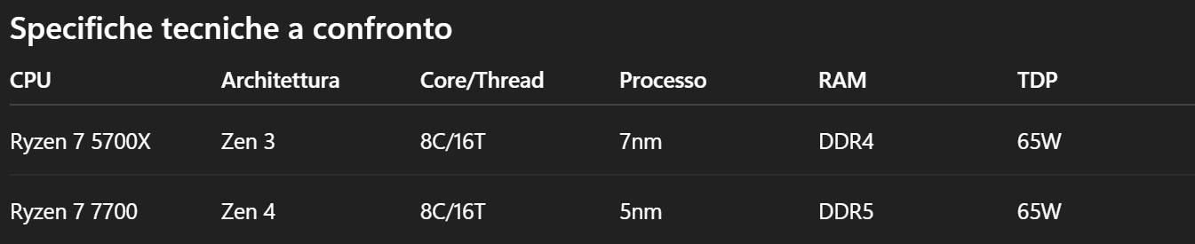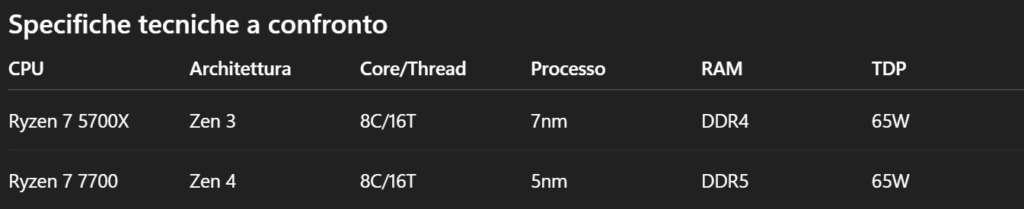 Il 7700, invece, introduce Zen 4, supporto DDR5 e PCIe 5.0, ma richiede motherboard AM5 e RAM di nuova generazione.